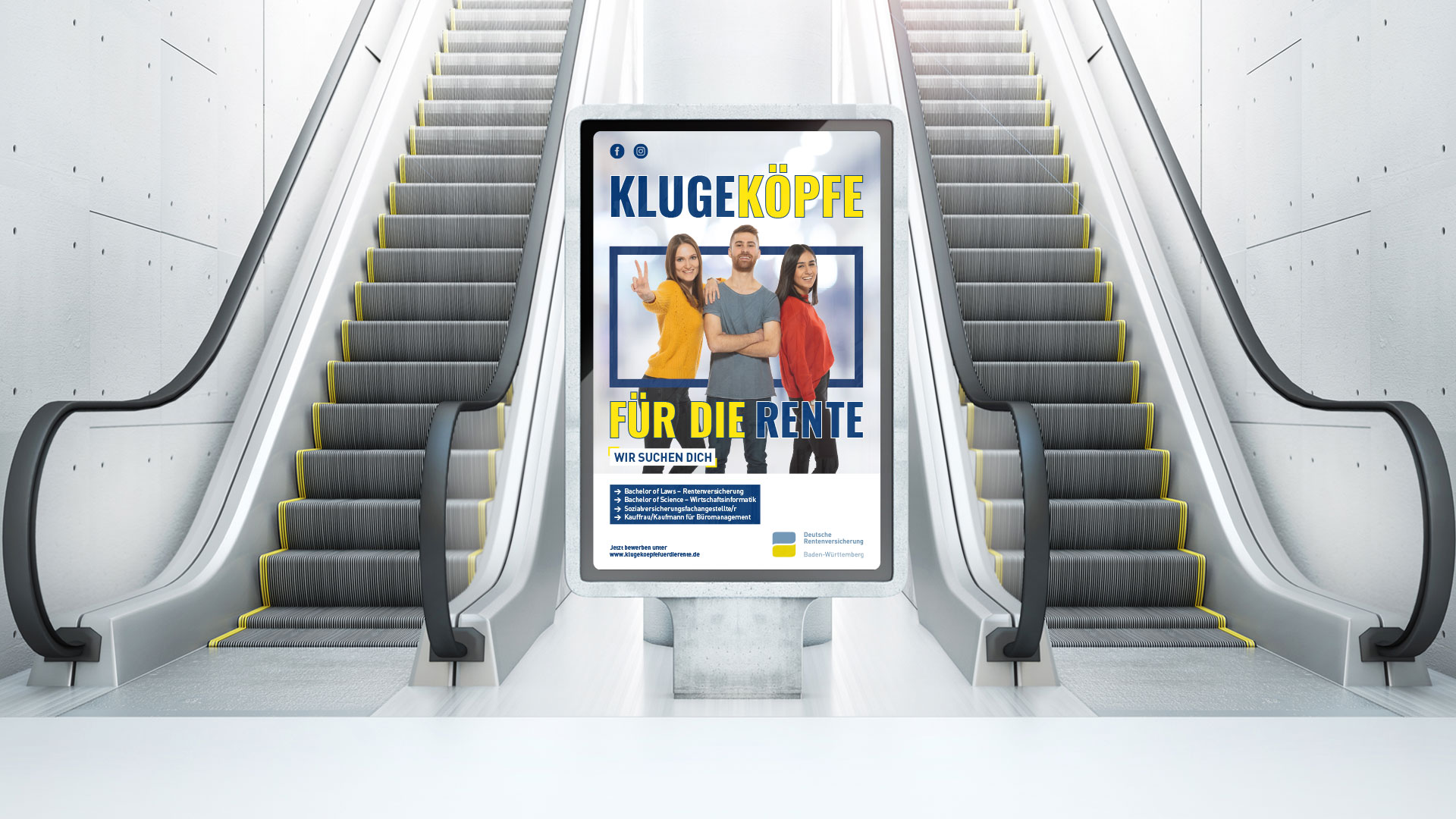 Mit der Kampagne „Kluge Köpfe für die Rente“ erstellten und setzten wir einen umfangreichen Maßnahmenkatalog für erfolgreiches Employer Branding um. Ziel war es, qualifizierten Nachwuchs von einer Ausbildung oder einem Studium bei der DRV Baden-Württemberg zu überzeugen.